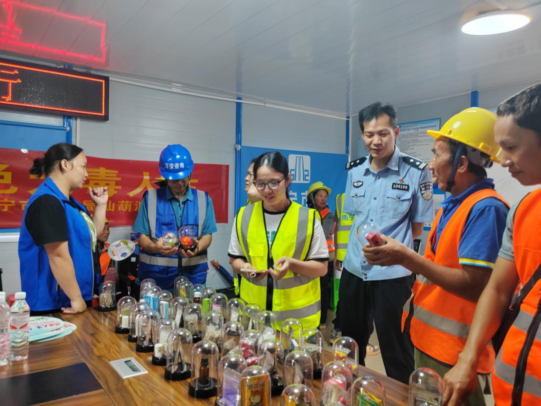 民警结合当前新型毒品的滥用形势向工地人员开展毒品预防宣讲。(图源:青秀区禁毒办)