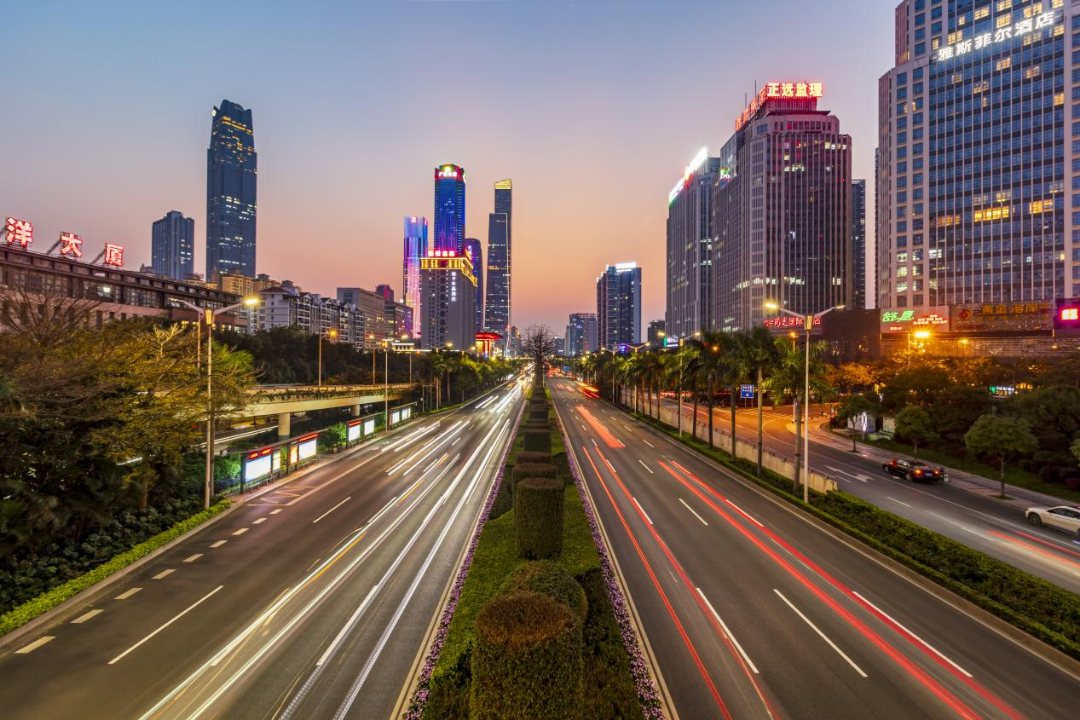 川流不息的车流染上金色的晕影