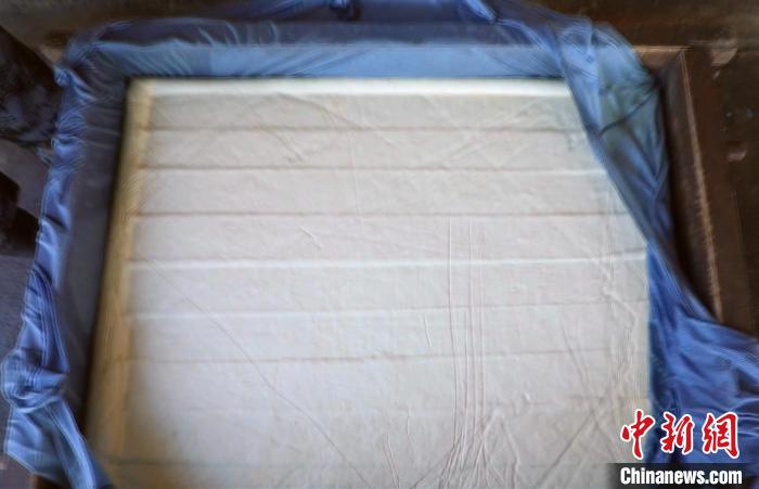 豆浆与石膏相遇,化学反应后,豆香味萦绕在鼻尖,香气弥漫在空气中。这时,王志勇盖上空隙均匀的木头压板,压上石墩子,让豆腐脑中的水分通过笼布和盖板上的洞流走,等待豆腐压好成型。