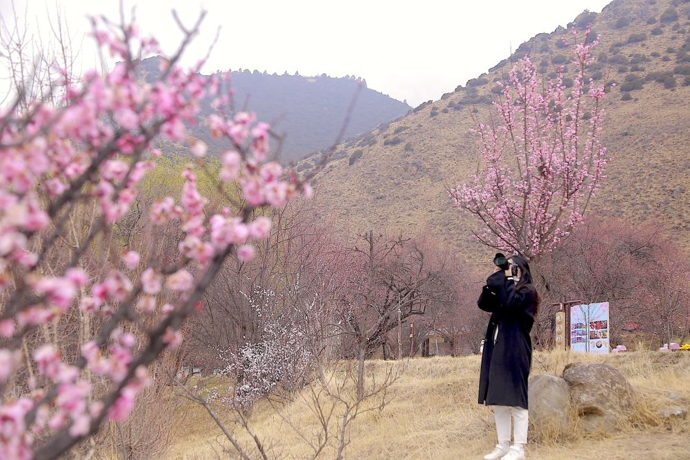 游客在嘎拉村赏花游玩,拍摄盛开的桃花。新华社记者 邱星翔 摄