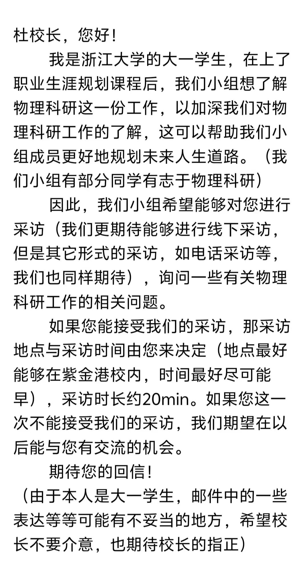 近日在职业生涯规划课的课后浙江大学2023级的4位本科同学抱着尝试的心态向校长杜江峰发了一封邮件咨询物理领域科研工作的相关情况