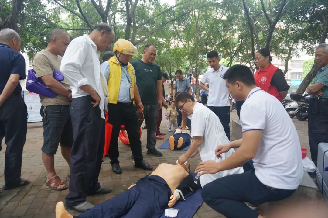红十字应急救护培训师手把手地教居民在模拟人身上进行心肺复苏操作、成人及婴幼儿异物卡喉急救操作、防溺水注意事项等,提高居民自救互救技能。