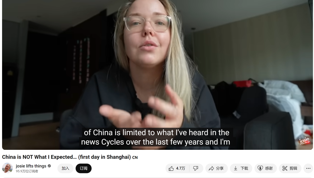澳大利亚博主Josie lifts things也表示自己对于中国的了解都来自新闻报道,非常狭隘。