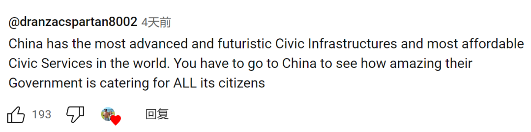 中国有着世界上最先进和未来化的公共设施、最平价的公共服务。你们一定要去中国看看他们的政府是怎么服务所有公民的,令人惊叹。
