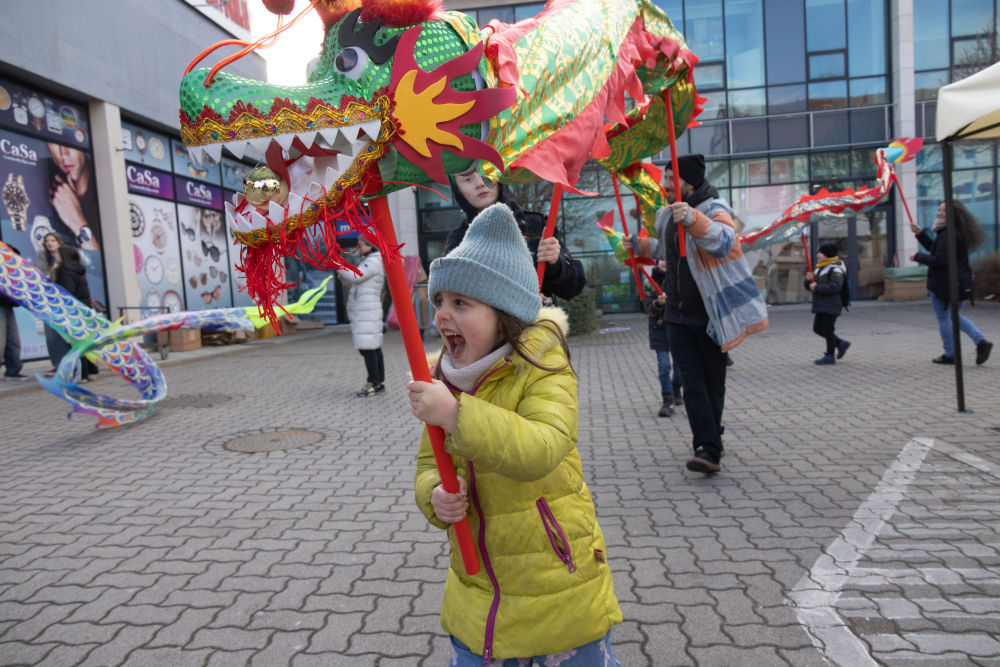 2024年2月3日,一名女孩在匈牙利布达佩斯唐人街的新春庙会上体验舞龙。