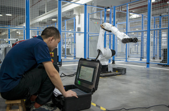 在广东拓斯达科技股份有限公司,工作人员对一台工业机器人进行绝对定位精度的校准(5月17日摄)。新华社记者 徐嘉懿 摄