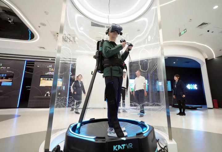 在位于江苏苏州昆山市的昆山元宇宙产业园元宇宙展示厅里,参观者体验VR游戏(6月1日摄)。新华社记者 李尕 摄