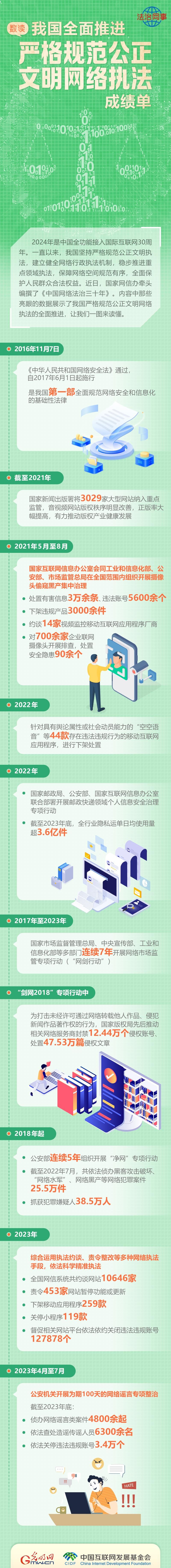 2024年是中国全功能接入国际互联网30周年。一直以来,我国坚持严格规范公正文明执法,建立健全网络行政执法机制,稳步推进重点领域执法,保障网络空间规范有序,全面保护人民群众合法权益。近日,国家网信办牵头编撰了《中国网络法治三十年》,内容中那些亮眼的数据展示了我国严格规范公正文明网络执法的全面推进,让我们一图来读懂。