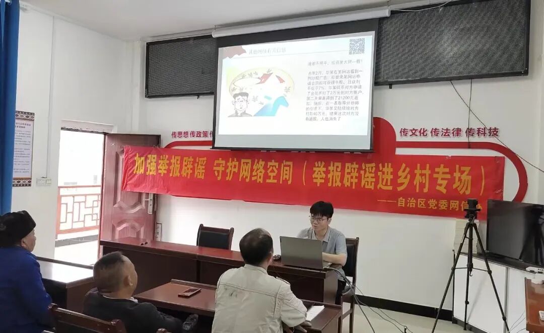 为进一步提升基层群众对网络谣言和互联网违法信息的辨识能力,6月26日上午,自治区党委网信办联合百色隆林各族自治县德峨镇德峨村驻村工作队到当地新时代文明实践站开展“加强举报辟谣 守护网络空间”举报辟谣宣传进乡村活动,为村“两委”干部及群众宣传网络举报和辟谣相关知识,现场共有村“两委”干部、驻村工作队员及群众共30余人参加。