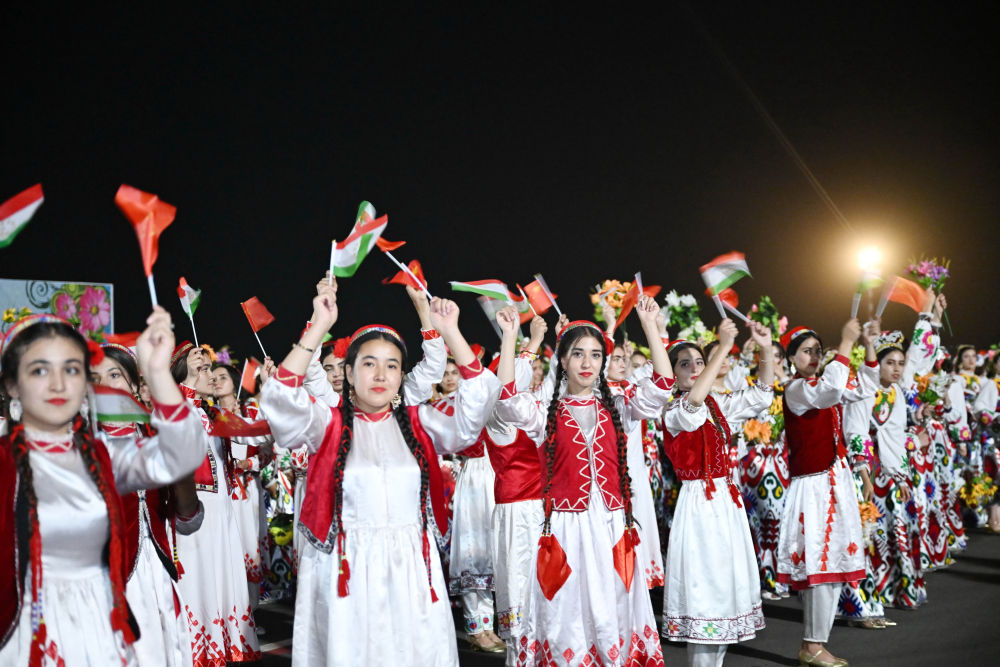 拉赫蒙在机场为习近平举行盛大隆重的迎宾仪式。1500多名身着民族盛装的塔吉克斯坦青年表演富有浓郁特色的中塔歌舞,挥舞中塔两国国旗,表达对中国最尊贵客人的热烈欢迎。