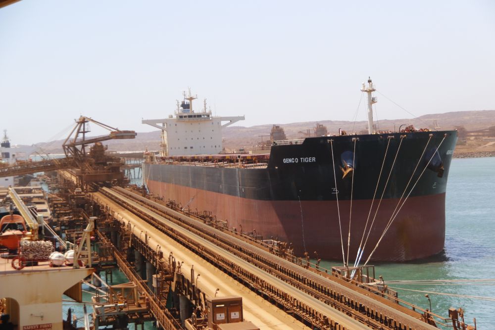 2023年10月20日,一艘运输铁矿石的远洋货轮停泊在澳大利亚的丹皮尔港。新华社记者郝亚琳摄