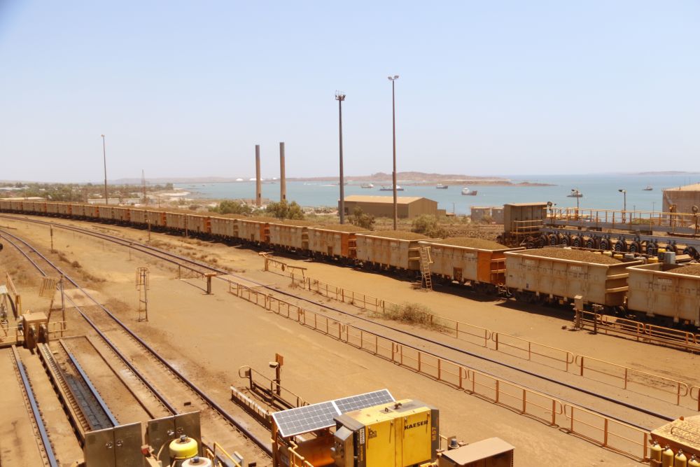 2023年10月20日,在澳大利亚卡拉萨,一列货运列车正在将铁矿石运往港口装船。新华社记者郝亚琳摄