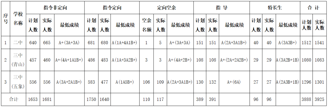 其中南宁二中实际录取1541人,比原计划多录取了29人;南宁三中(青山校区)实际录取1083人,比原计划多录取了3人;南宁三中(五象校区)实际录取1301人,比原计划多录取5人,实际录取人数超过计划招生人数的属最后一名成绩有并列所致。