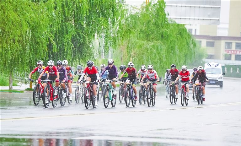 堆龙德庆站比赛中,选手冒雨骑行。