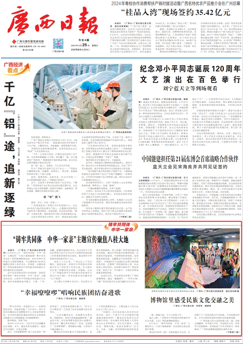 8月24日上午,“铸牢共同体 中华一家亲”主题宣传“八桂大地展新颜”集中采访活动在广西民族博物馆启动。来自30家中央和地方主要新闻媒体、行业媒体的120多名编辑记者深入我区采访,多角度、全媒体讲好广西加快推进铸牢中华民族共同体意识示范区建设的生动故事。