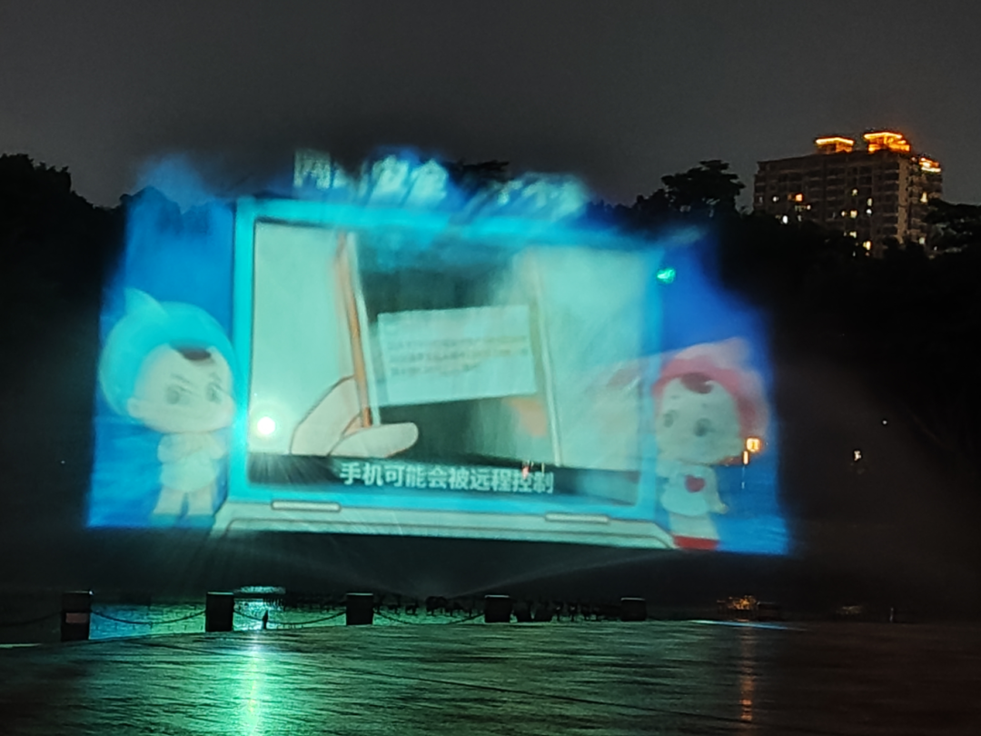 9月13日晚,南湖公园水幕电影广场投屏网络安全公益视频,普及网络安全知识,不少市民驻足观看。