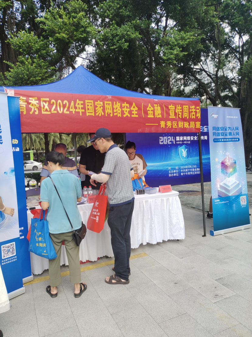 为了强化全民网络安全意识、宣传普及网络安全常识,青秀区财政局在国家网络安全宣传周期间,坚持线上与线下充分结合,发动群众广泛参与网络安全(金融)宣传教育相关活动,营造全社会共筑网络安全(金融)防线的浓厚氛围。