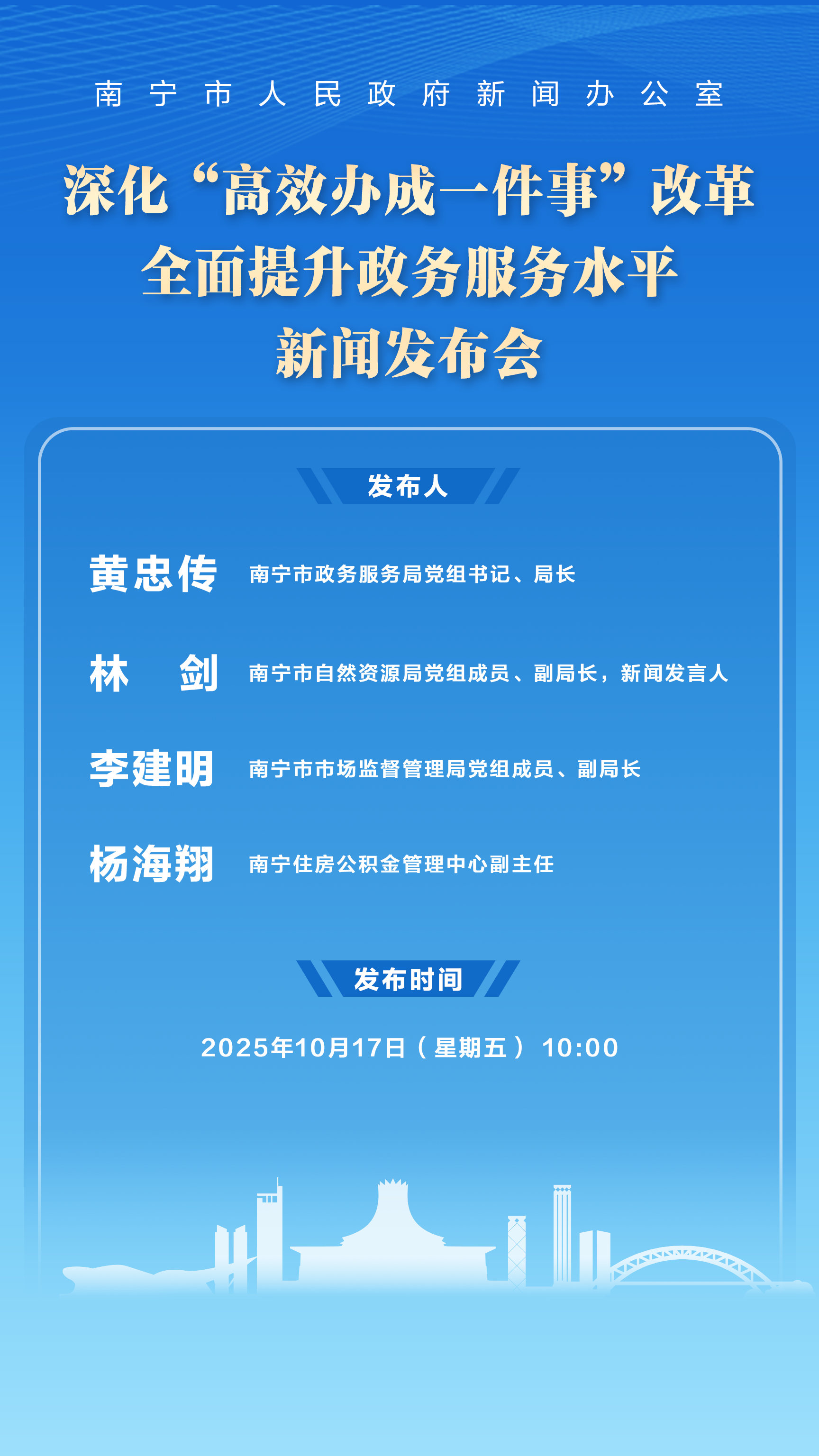 南宁市政府新闻办将于2025年10月17日(星期五)10:00举行深化“高效办成一件事”改革 全面提升政务服务水平新闻发布会,请南宁市政务服务局党组书记、局长黄忠传;南宁市自然资源局党组成员、副局长,新闻发言人林剑;南宁市市场监督管理局党组成员、副局长李建明;南宁住房公积金管理中心副主任杨海翔介绍南宁市深化“高效办成一件事”改革相关情况,并回答记者提问。