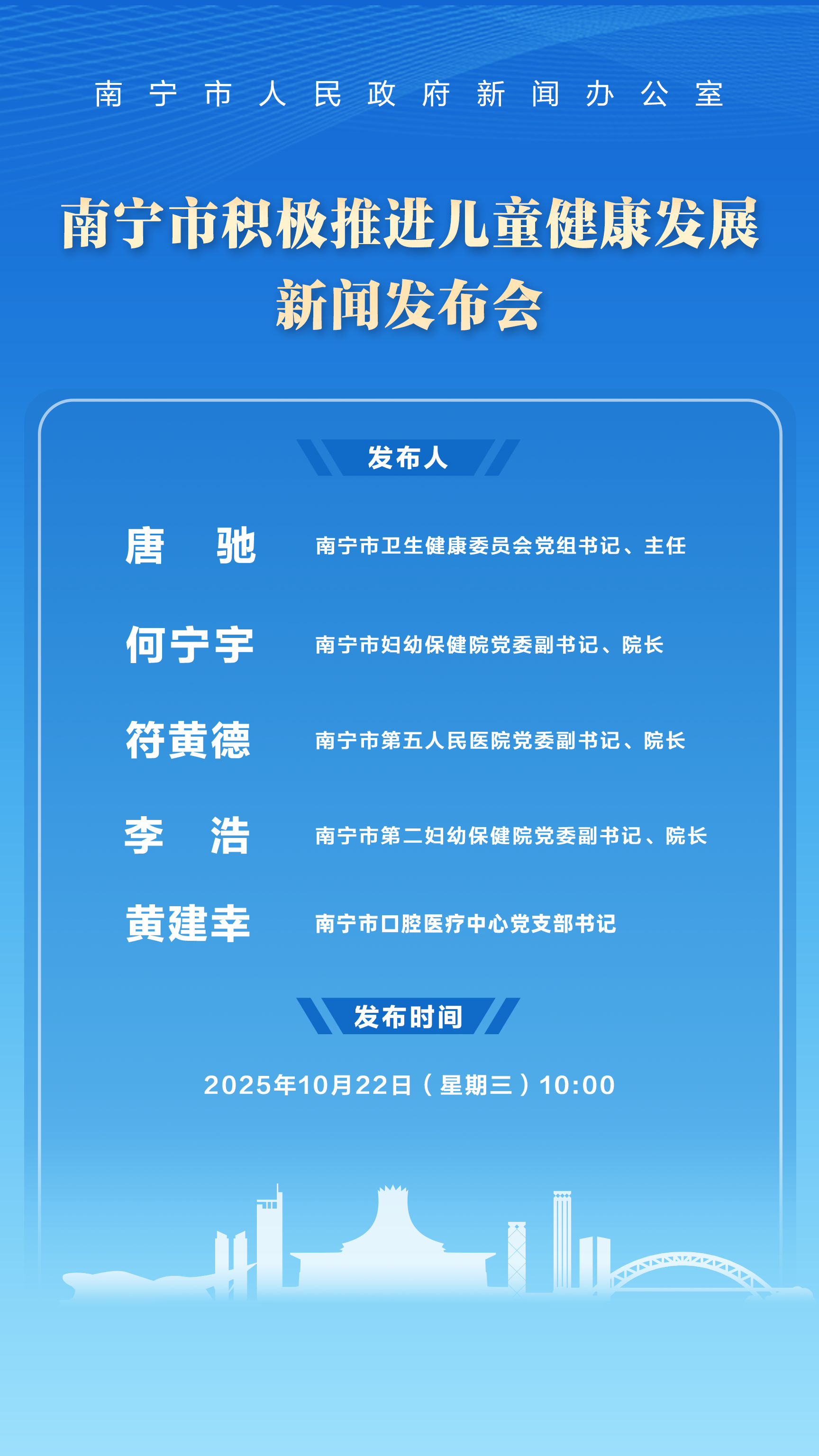 南宁市政府新闻办将于2025年10月22日(星期三)10:00举行南宁市积极推进儿童健康发展新闻发布会,邀请南宁市卫生健康委员会党组书记、主任唐驰,南宁市妇幼保健院党委副书记、院长何宁宇,南宁市第五人民医院党委副书记、院长符黄德,南宁市第二妇幼保健院党委副书记、院长李浩,南宁市口腔医疗中心党支部书记黄建幸介绍南宁市推进儿童健康发展方面的相关情况,并回答记者提问。