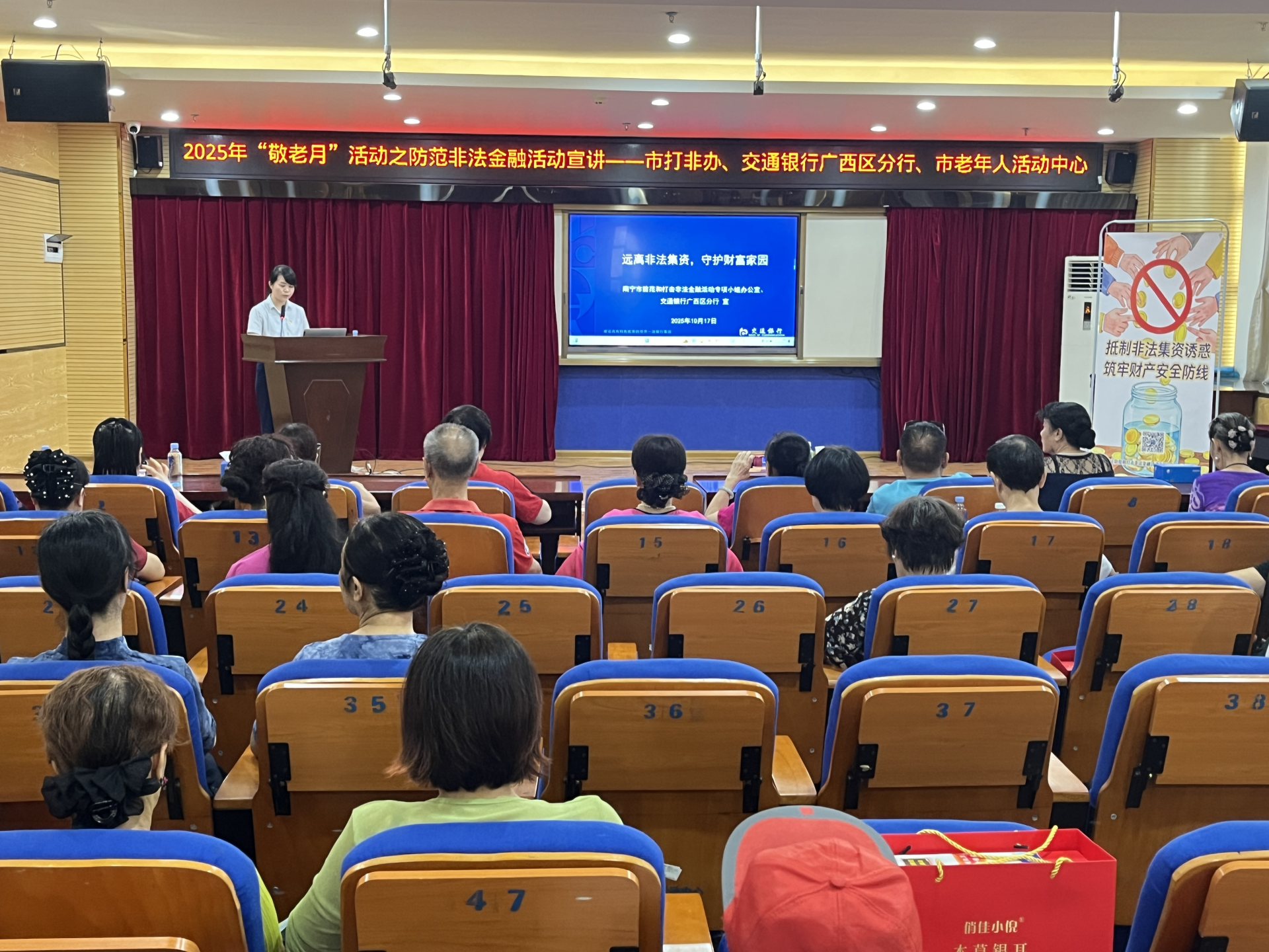 为深入贯彻落实自治区关于2025年“敬老月”活动的统一部署,切实维护老年群体的合法权益,近日,南宁市委金融办联合交通银行广西区分行、市老年人活动中心,根据自治区老龄委关于《2025年广西“敬老月”活动实施方案》相关要求,结合南宁市防范和打击非法金融活动专项工作小组办公室《关于建立南宁市金融素养提升工程乡镇(街道)、村(社区)与金融机构结对共建机制的通知》,于10月17日上午在南宁市老年人活动中心成功举办了一场以“守住钱袋子,护好幸福家”为主题的防范非法金融活动宣讲会。