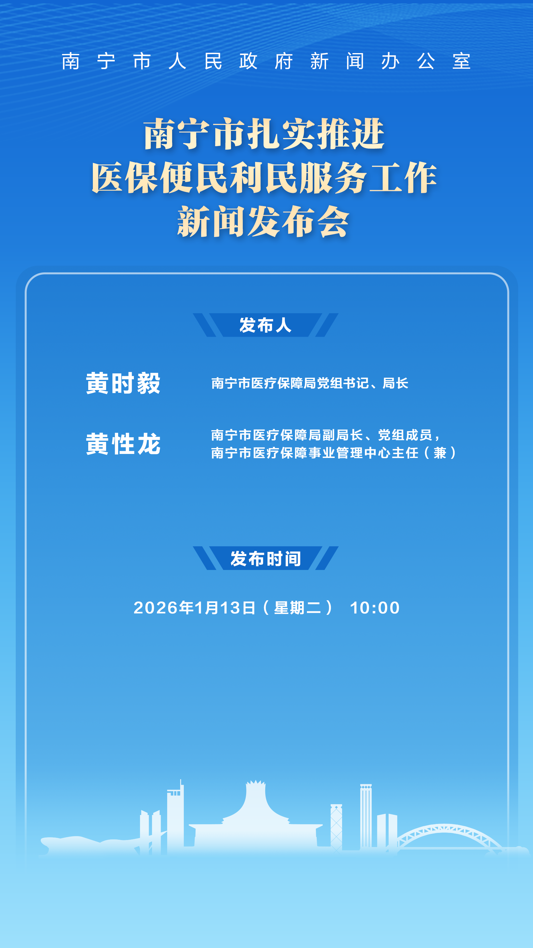 南宁市政府新闻办将于2026年1月13日(星期二)10:00举行南宁市扎实推进医保便民利民服务工作新闻发布会,邀请南宁市医疗保障局党组书记、局长黄时毅;南宁市医疗保障局副局长、党组成员,南宁市医疗保障事业管理中心主任(兼)黄性龙介绍相关情况并回答记者提问。