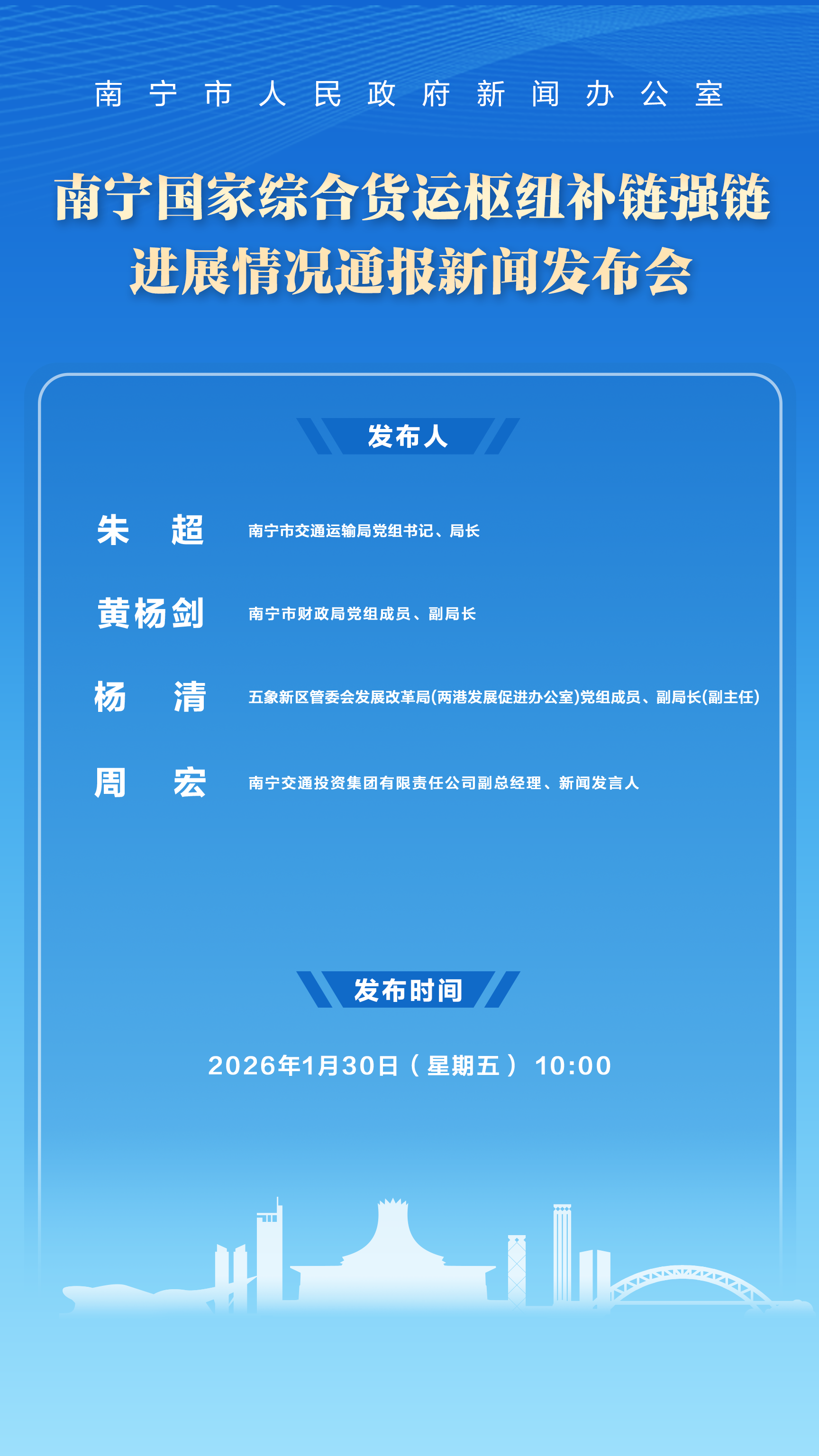 南宁市政府新闻办将于2026年1月30日(星期五)10:00举行南宁国家综合货运枢纽补链强链进展情况通报新闻发布会,邀请南宁市交通运输局党组书记、局长朱超,南宁市财政局党组成员、副局长黄杨剑,五象新区管委会发展改革局(两港发展促进办公室)党组成员、副局长(副主任)杨清,南宁交通投资集团有限责任公司副总经理、新闻发言人周宏介绍相关情况并回答记者提问。
