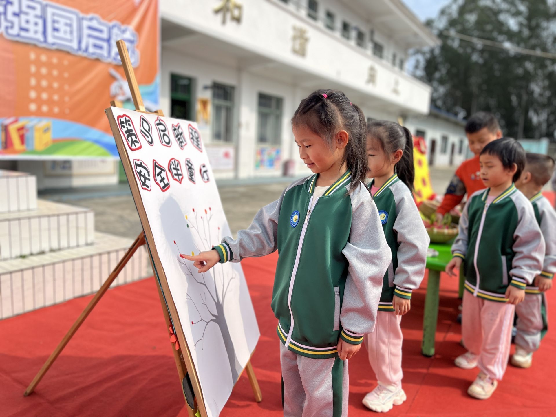 活动当天,长塘镇中心幼儿园里处处洋溢着新学期的喜悦。孩子们在老师的引导下依次穿过象征智慧与成长的“启智门”,迈过“跨栏成长”障碍,寓意勇敢面对新挑战。“好运投投乐”投掷游戏摊位前,小朋友们争先恐后地投出彩球,讨个新学期“好彩头”。“龙娃接福气”和“五福临门”环节更是将现场气氛推向高潮。簸箕里摆放着的西红柿、苹果、橘子、葱和鼓,分别寄托“柿柿如意”“平平安安”“大吉大利”“聪明伶俐”“一鼓作气”的美好祝愿。孩子们一边触摸吉祥物,一边兴奋地喊着:“我要平平安安!”“我要聪明伶俐!”欢声笑语中,浓浓的祝福浸润心田。随后进行的“安全‘童’行,共绘平安校园”国旗下讲话,则是向幼儿们传递出“我是安全小卫士”的责任感。