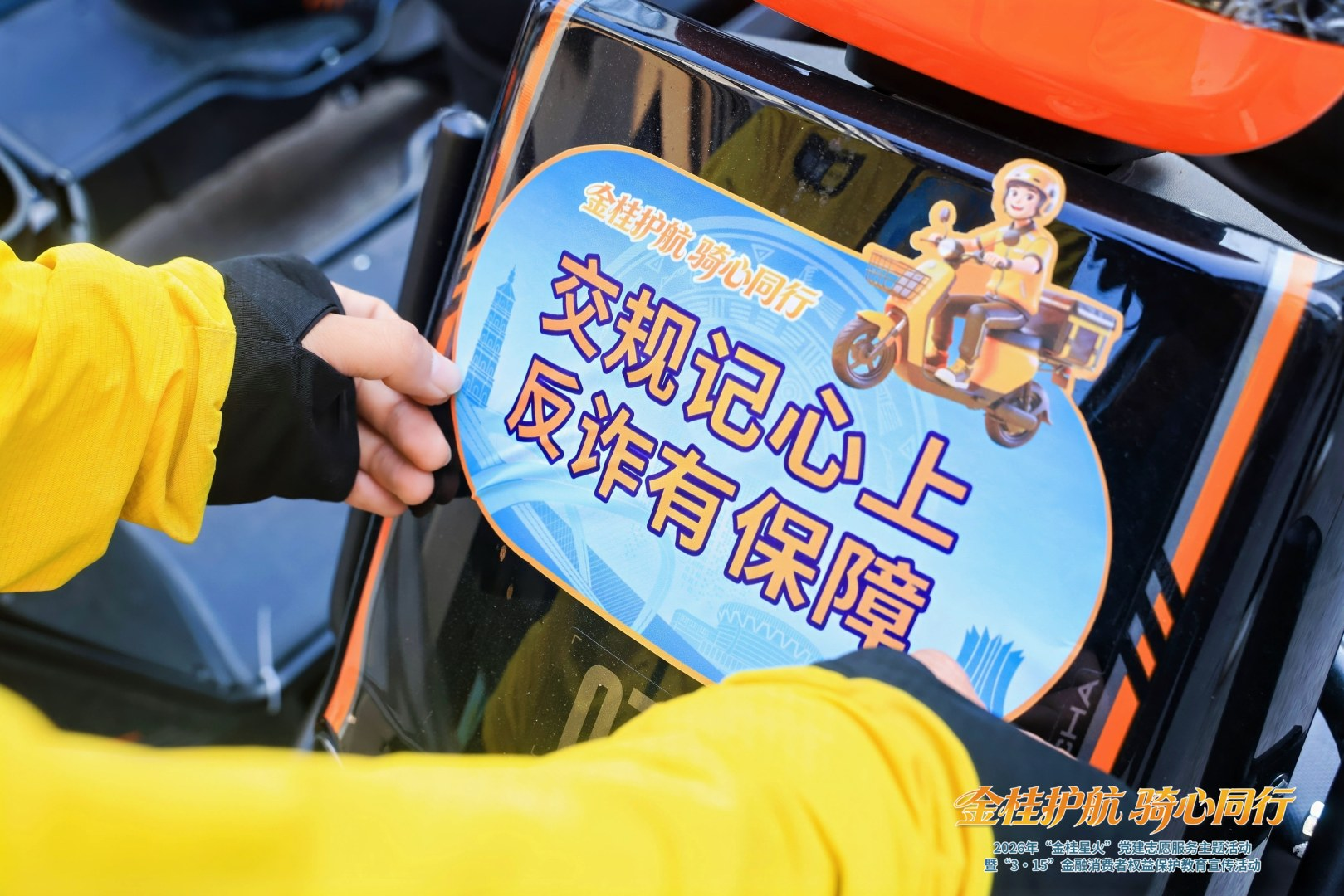 活动打造“流动金融消保+反诈宣传站”,让金融知识随骑手的配送轨迹遍布城市街巷。启动仪式上,参加活动的嘉宾向外卖骑手代表赠送首批“金桂护航”主题宣传标语贴,外卖骑手们现场将标语贴张贴于送餐箱与车身,广西约2.6万名外卖骑手化身金融知识流动宣传员。同时,美团(广西)旗下约6.5万户合作商户同步参与,通过餐食封签将金融知识和风险提示融入日常配送,实现“一次配送、一次宣传”,让金融消保知识借助外卖配送网络,走进千家万户、覆盖街头巷尾。