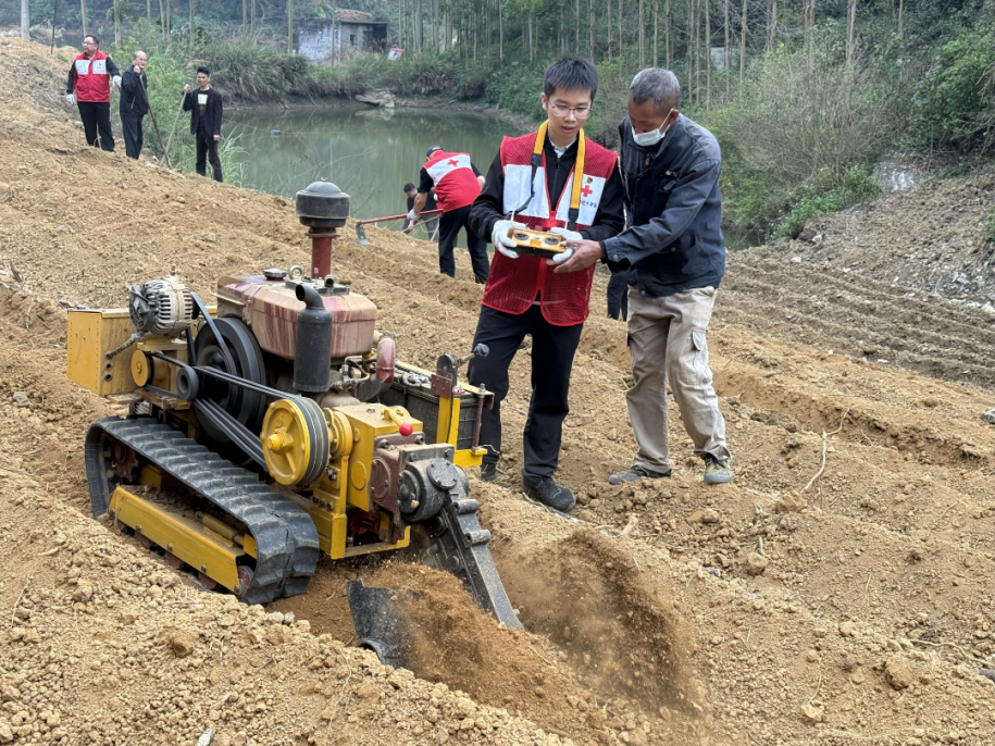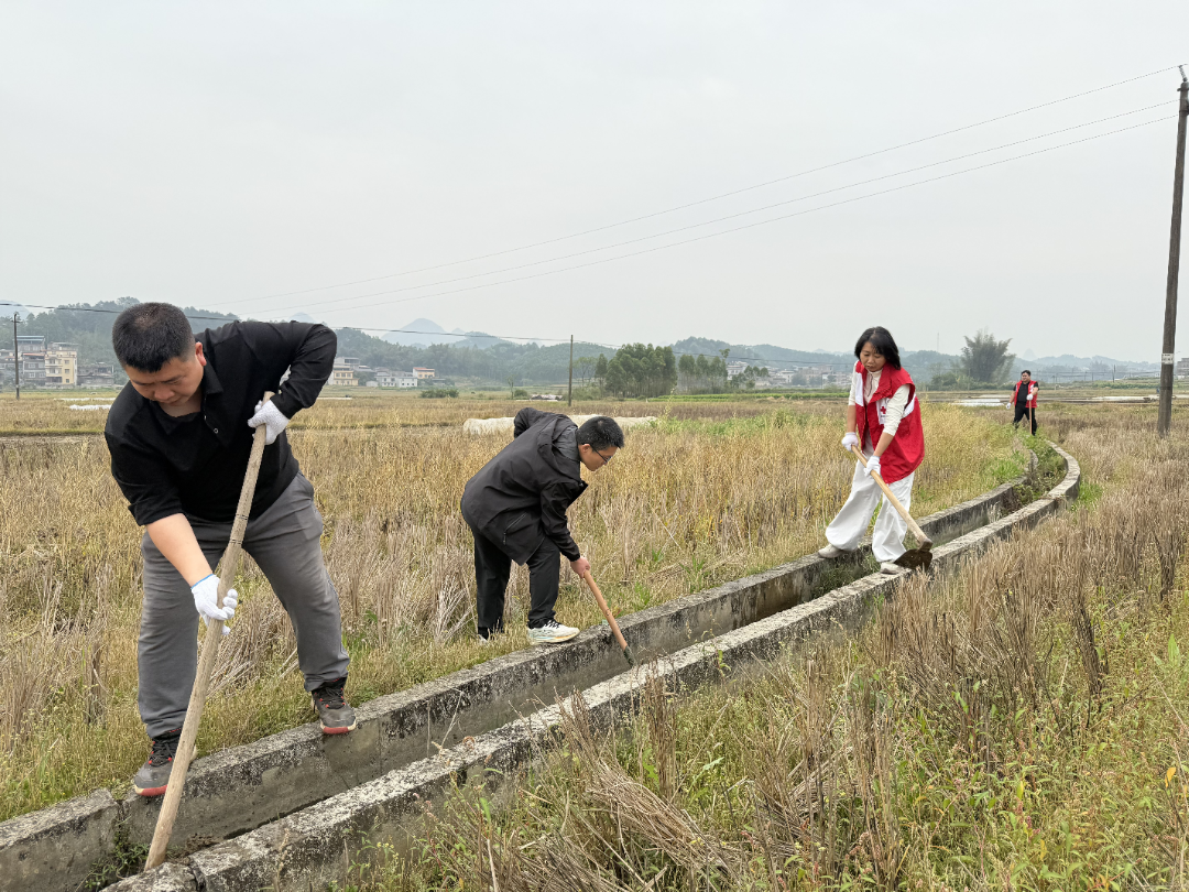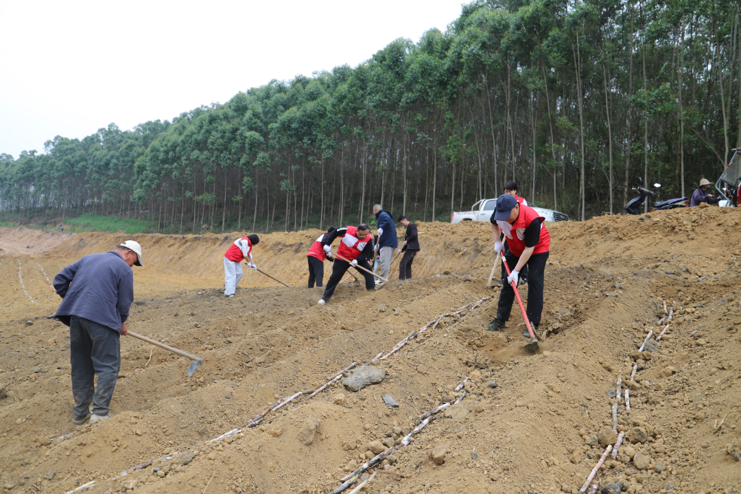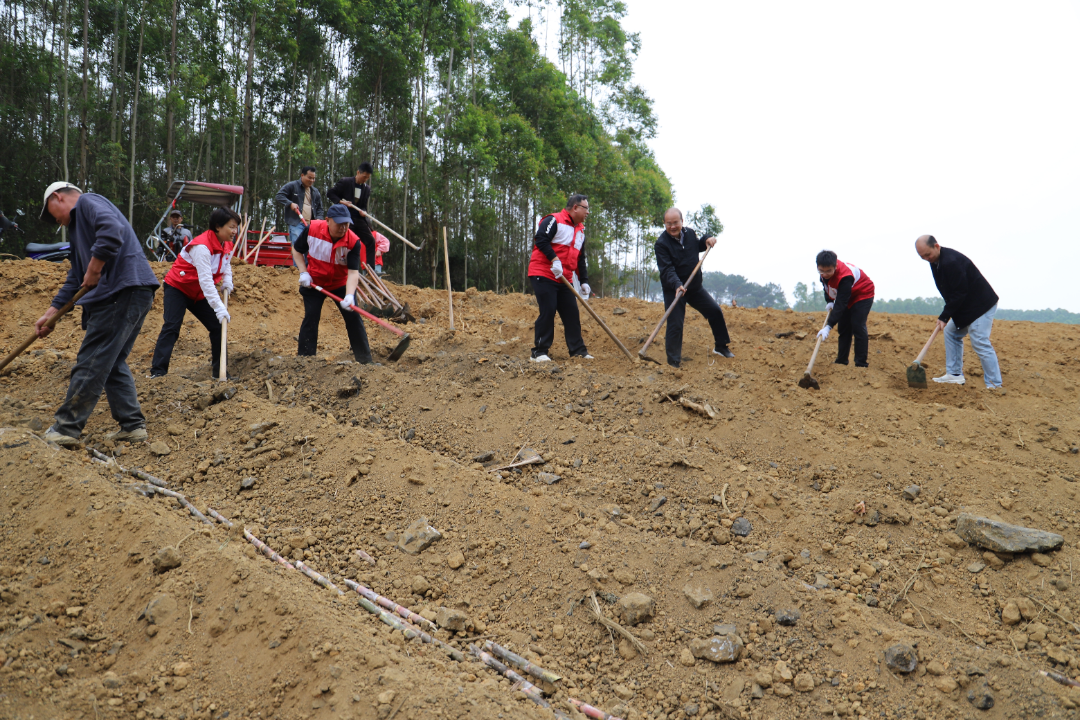 在板樊庄后山甘蔗地里,市红十字会党员干部与乡镇干部、驻村队员相互配合,在蔗农的指导下,热火朝天地搬运蔗苗、培土。大家还和村民一起体验了现代AI技术,现场遥控操作甘蔗培土机。田野间,机关党员干部职工拿起锄头、铁铲,认真清理灌溉水渠里的淤泥,为春耕灌溉疏通“最后一公里”。