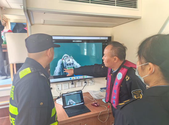 执法人员在查看无人机传回的巡查画面。