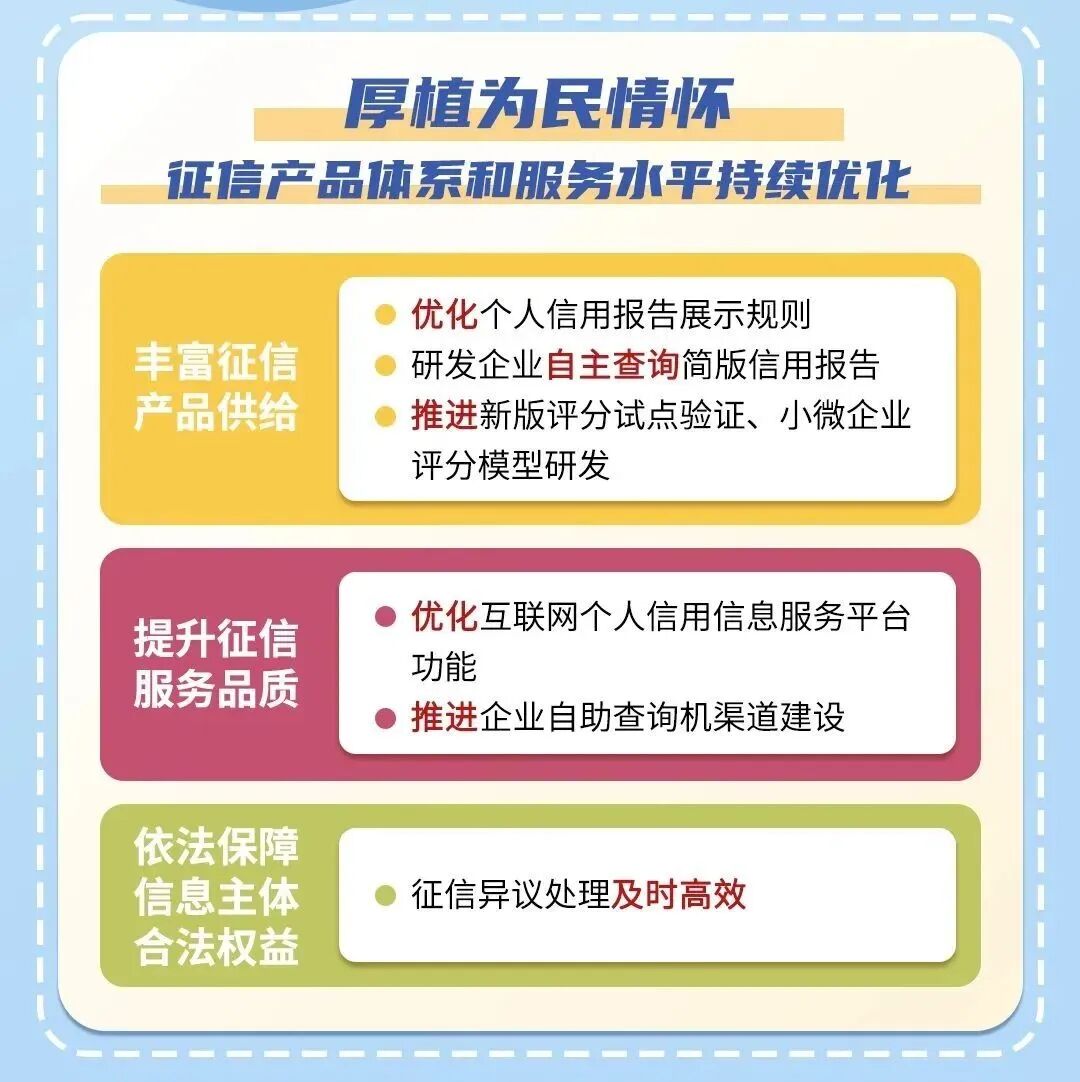 ☑ 征信产品体系和服务水平持续优化。丰富征信产品供给。优化个人信用报告展示规则;研发企业自主查询简版信用报告;推进新版评分试点验证、小微企业评分模型研发。提升征信服务品质。优化互联网个人信用信息服务平台功能;推进企业自助查询机渠道建设。依法保障信息主体合法权益。征信异议处理及时高效。