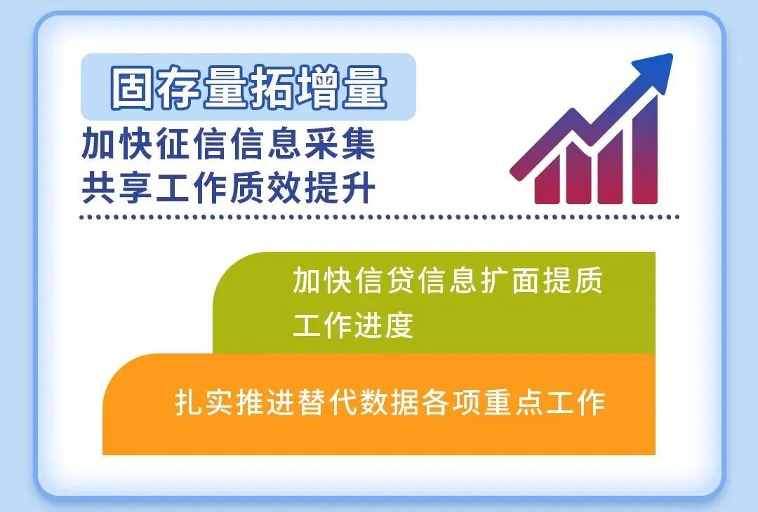 ☑ 固存量拓增量。加快征信信息采集共享工作质效提升。加快信贷信息扩面提质工作进度,扎实推进替代数据各项重点工作。