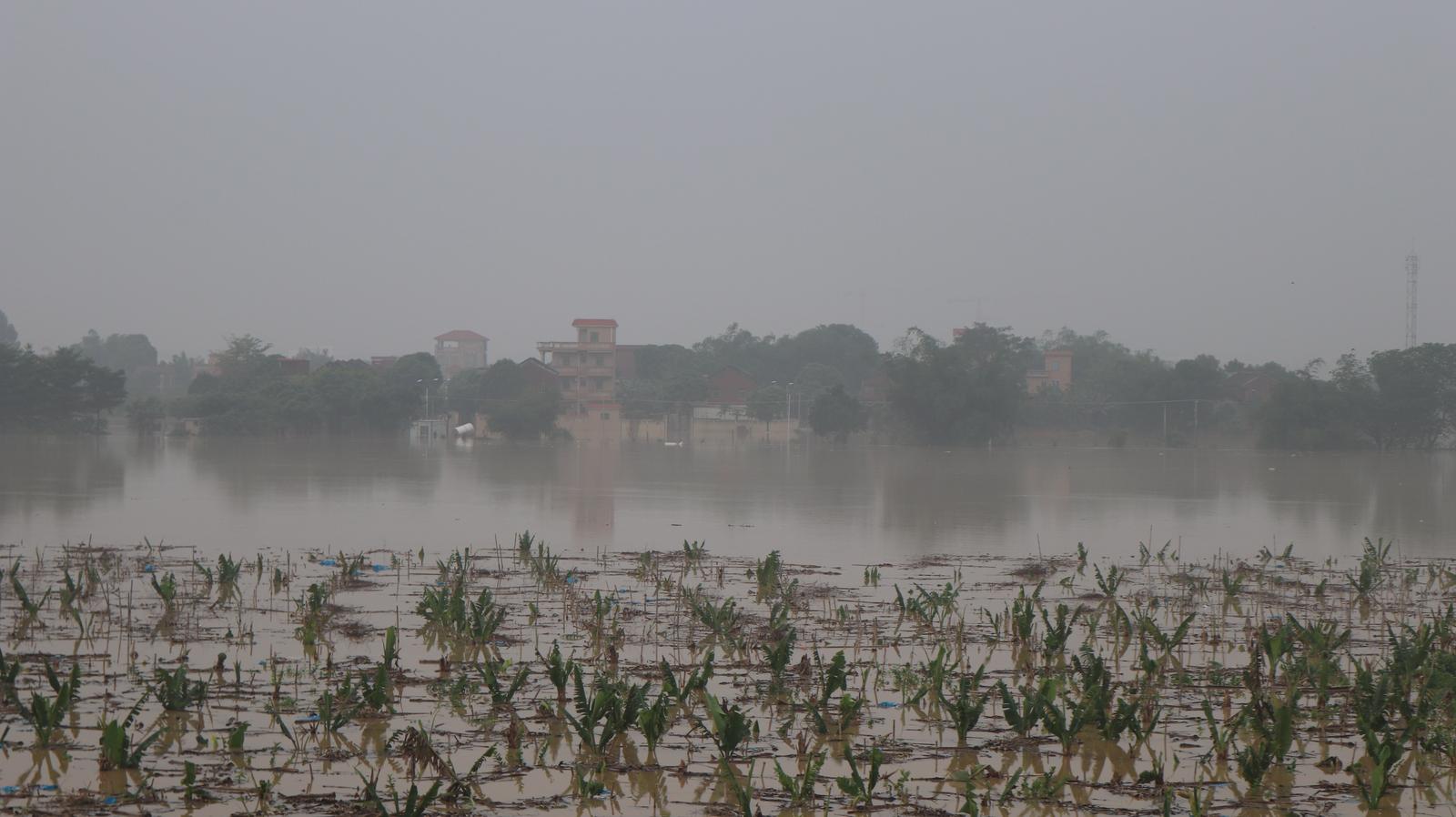 近处是滩涂上种植的一片农作物已经被水淹没,远处是有村民居住的岛屿,该岛屿也受到了洪水侵袭