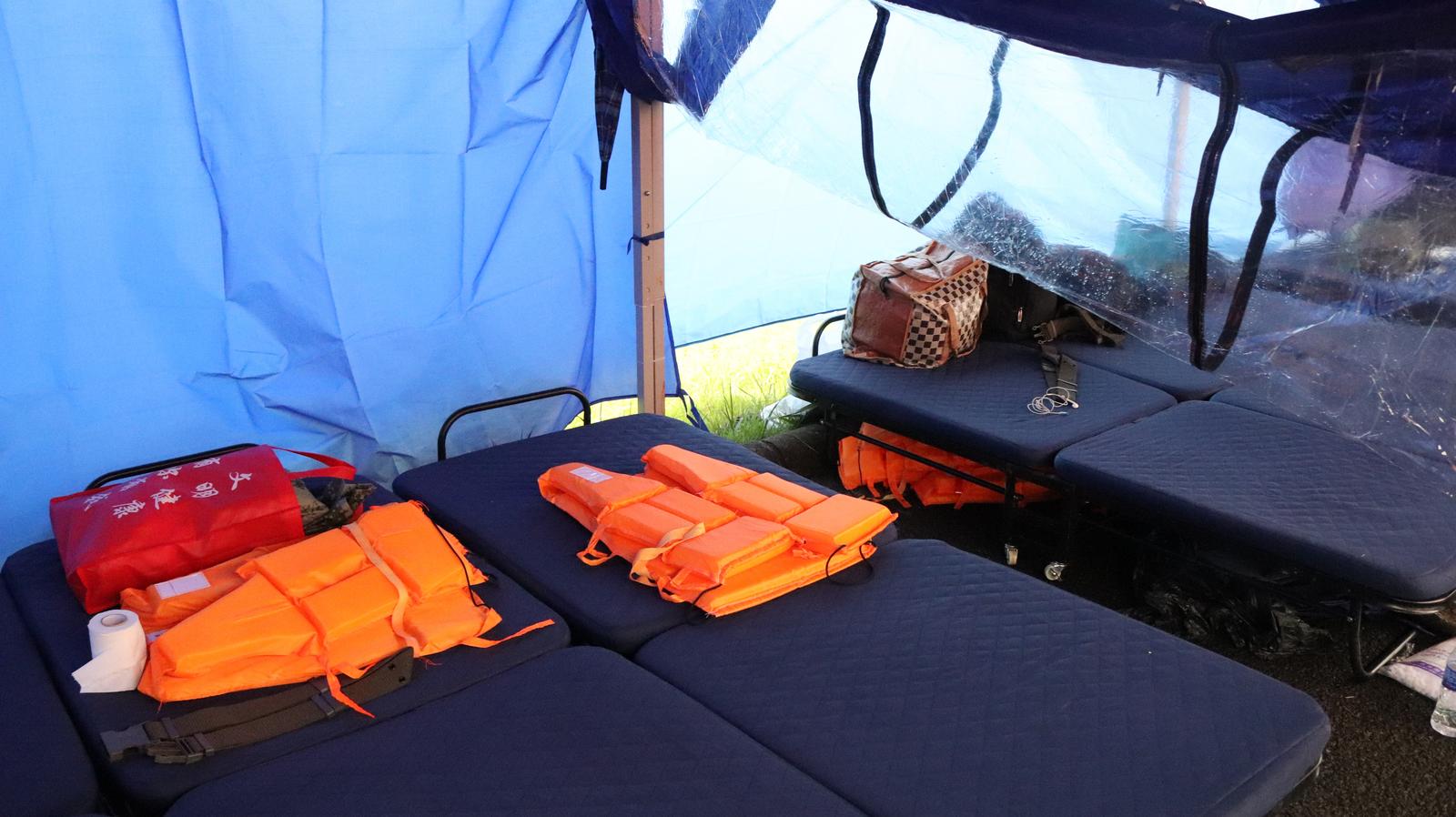 在堤坝之上,记者还看到就地搭建好的帐篷。帐篷内放置着10张折叠床,并配备有充足的饮用水、食品等物资。而这就是巡堤员这几天临时的“家”。